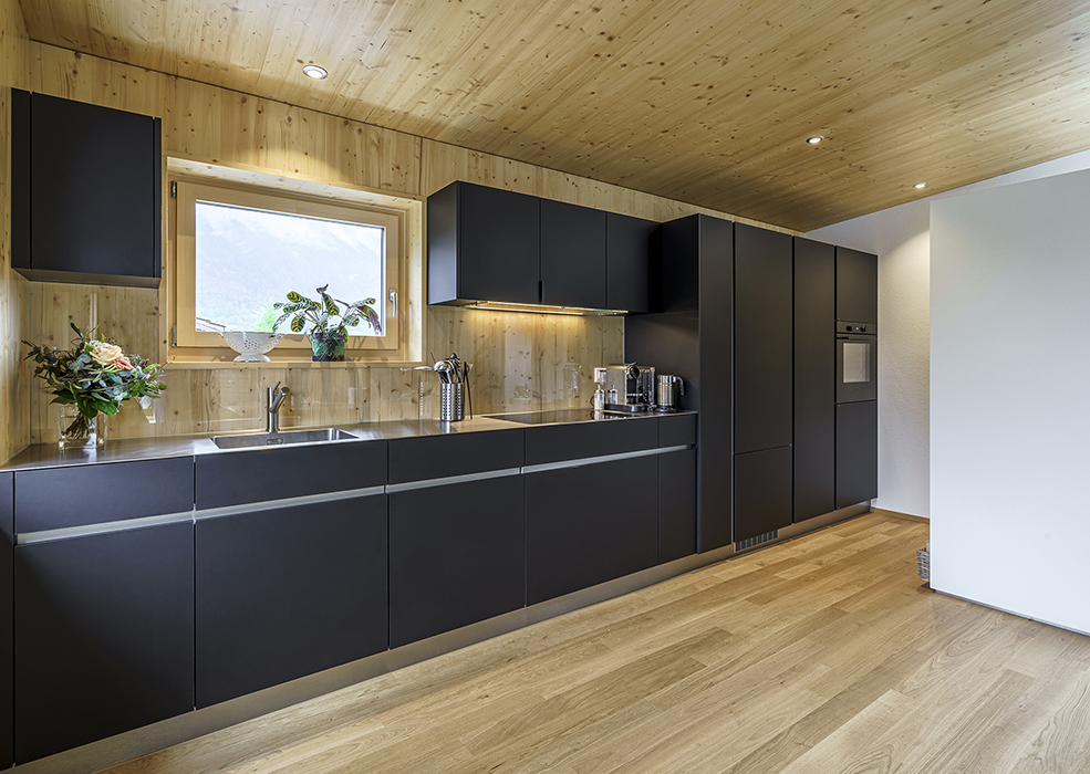 Massivholzfronten kombiniert mit Granitstein, Kunstharzabdeckung oder anderen Materialien geben ein Gefühl von Heimat und Zufriedenheit. Frutiger Schreinerei setzt jede Idee um – je aussergewöhnlicher, desto besser.