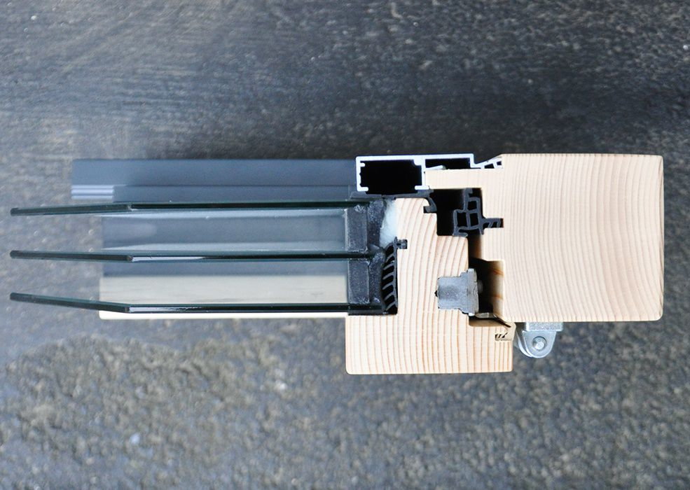 Hochisolierende 3-fach Gläser, zur Statikeinbindung technisch mit dem Holzrahmen verklebt. Der Fensterholzrahmen mit glaslichtbündigem Rahmenprofil und 3-Kammer-Mitteldichtung. Wetterschenkel mit thermisch trennender Clipsbefestigung, geklebten Endstücken und Silikon-Anschlagdichtung.